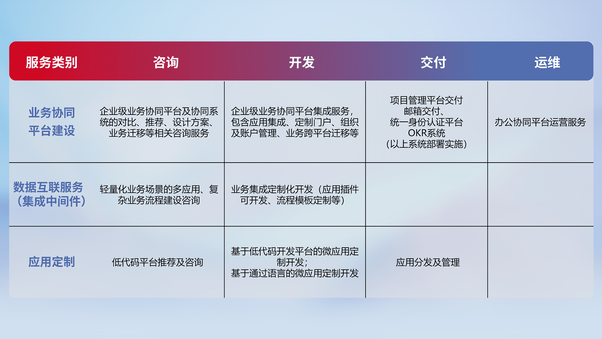 针对钉钉、、、、企微、、IDaas等平台级产品提供产品的规划、、、、方案、、、、交付、、、、定制化开发等服务,,,,实现如统一协同办公、、、智能客户服务、、、、混合会议管理、、智能数据查询、、等业务场景,,实现数字化转型。。