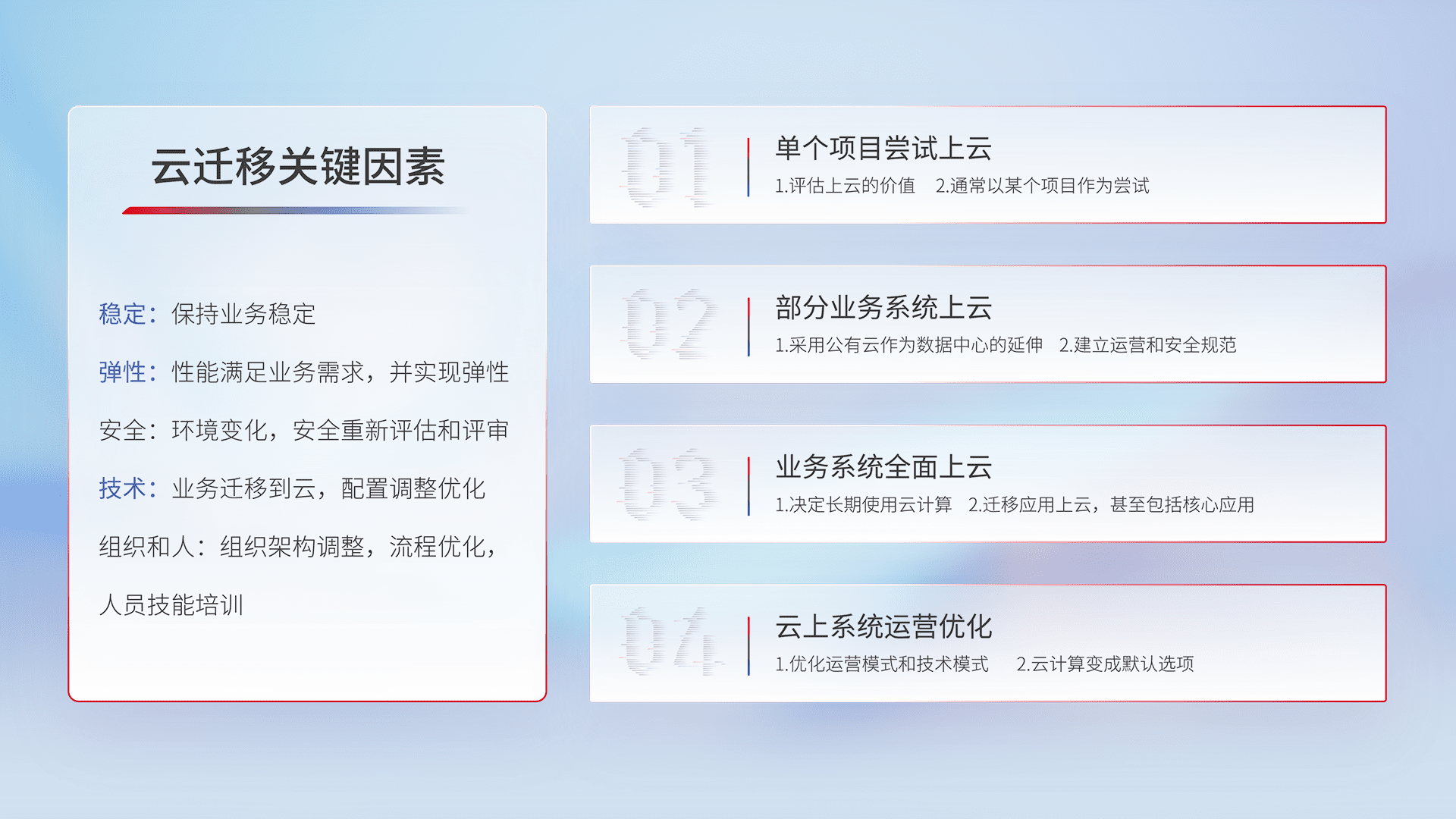 结合实际业务,,,,从规划设计、、、云平台选型、、、云原生改造、、、、数据迁移、、集成交付,,,迁移全过程为客户识别最佳上云路径,,做好风险识别管理,,,,设计网络架构、、、、身份权限、、、安全审计合规、、、、操作审计、、日志审计、、、、监控告警策略、、多站点容灾设计等,,,对云上基础设施进行整体规划,,,,提升IT治理水平,,以满足弹性、、、高可用、、高性能的需求。。。