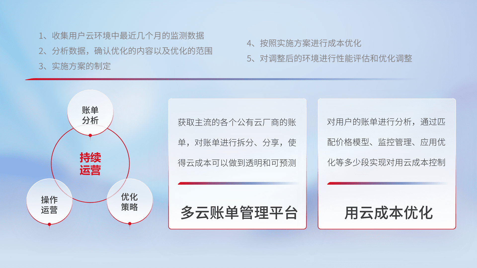 通过多云纳管,,,以统一的资源数据模型把客户的云资源进行抽象和封装,,,进而实现对多云资源的统一操作,,,保障云资源管理的可靠性、、、、稳定性与可用性。。量身定制化运维内容,,,配置、、开发运维、、、、补丁管理、、备份、、、、监控、、、、认证和访问管理、、、审计和日常巡检等,,,保障在用云过程中的可靠度,,,,稳定度以及高可用率。。。